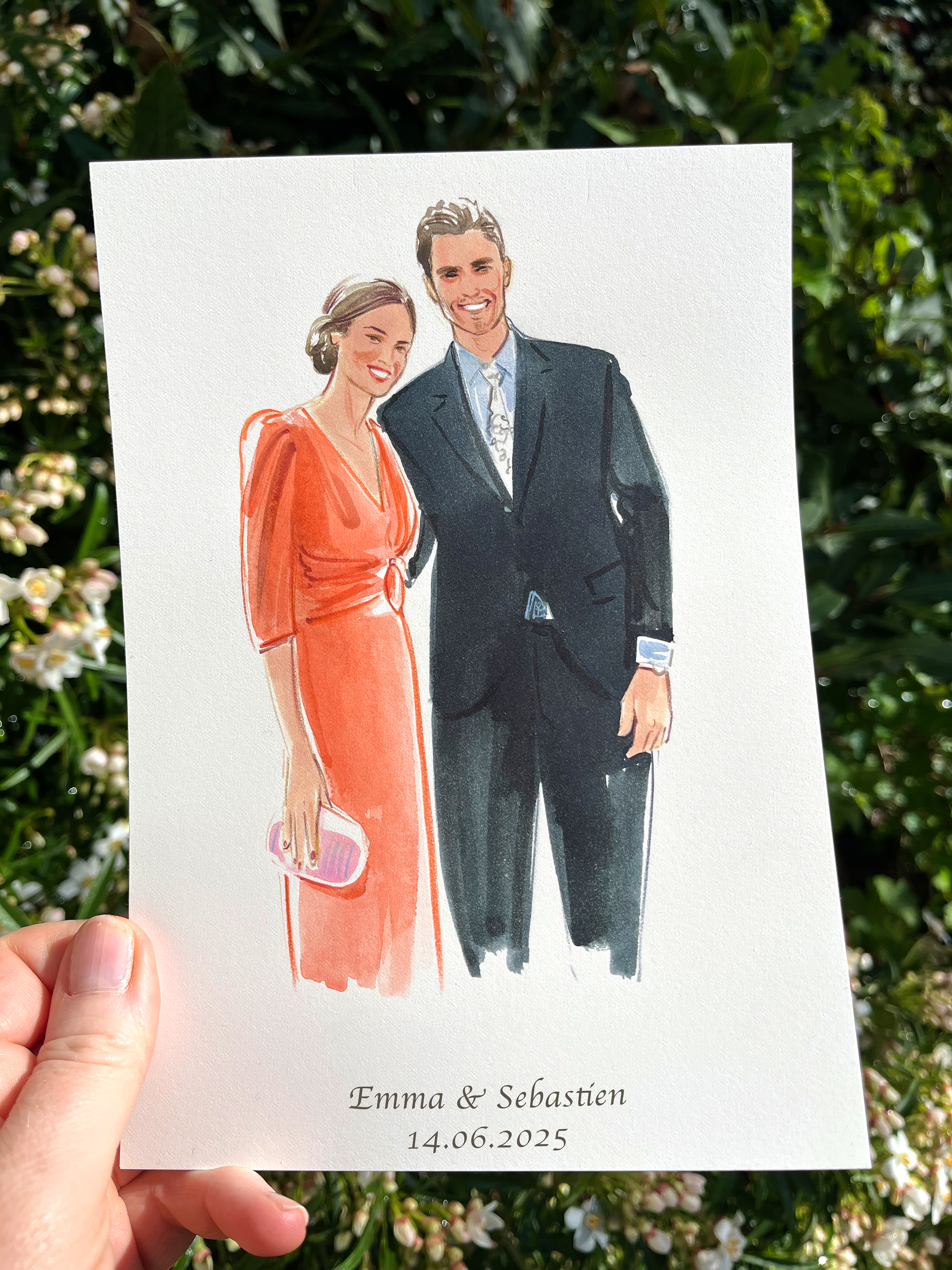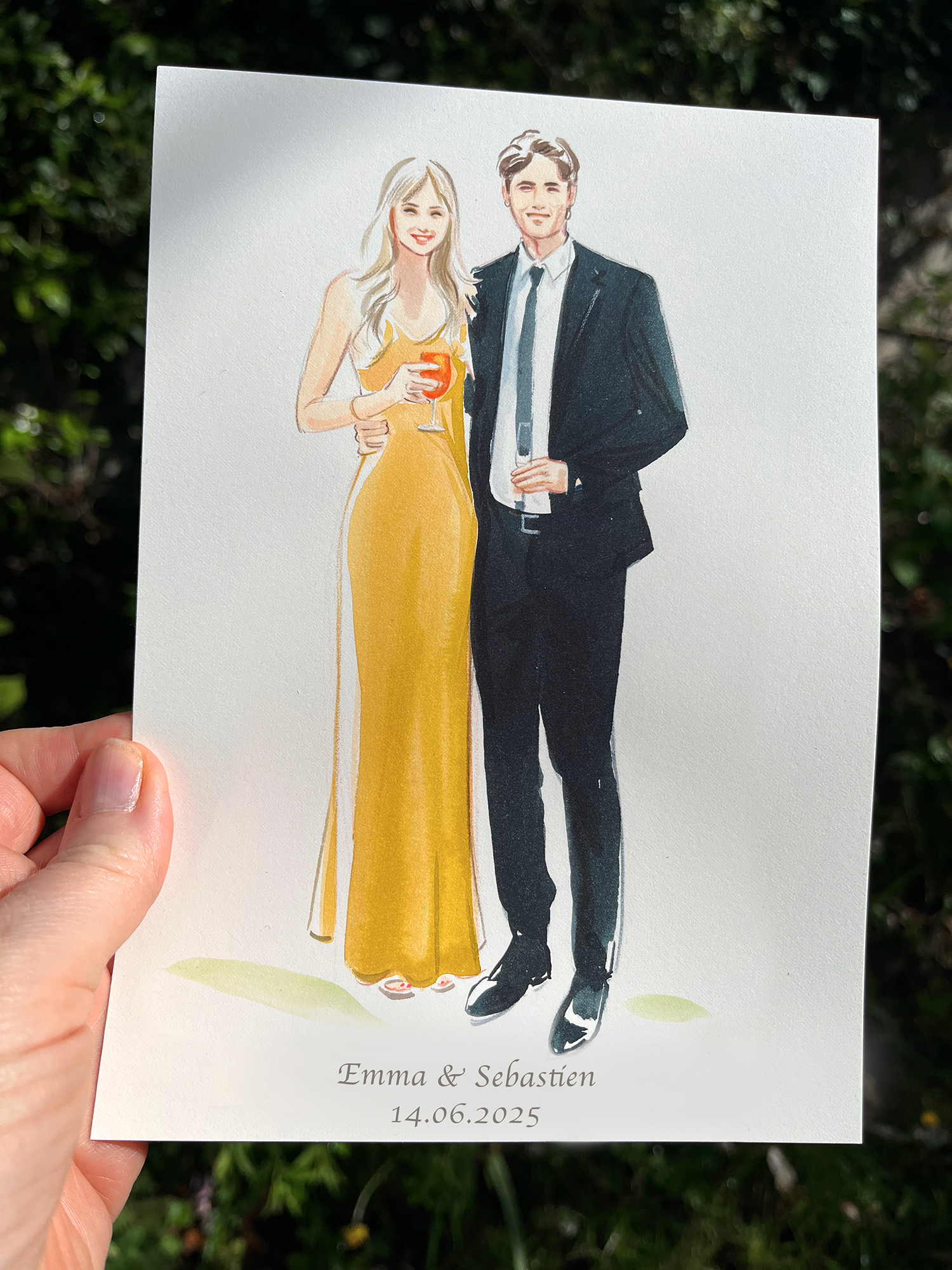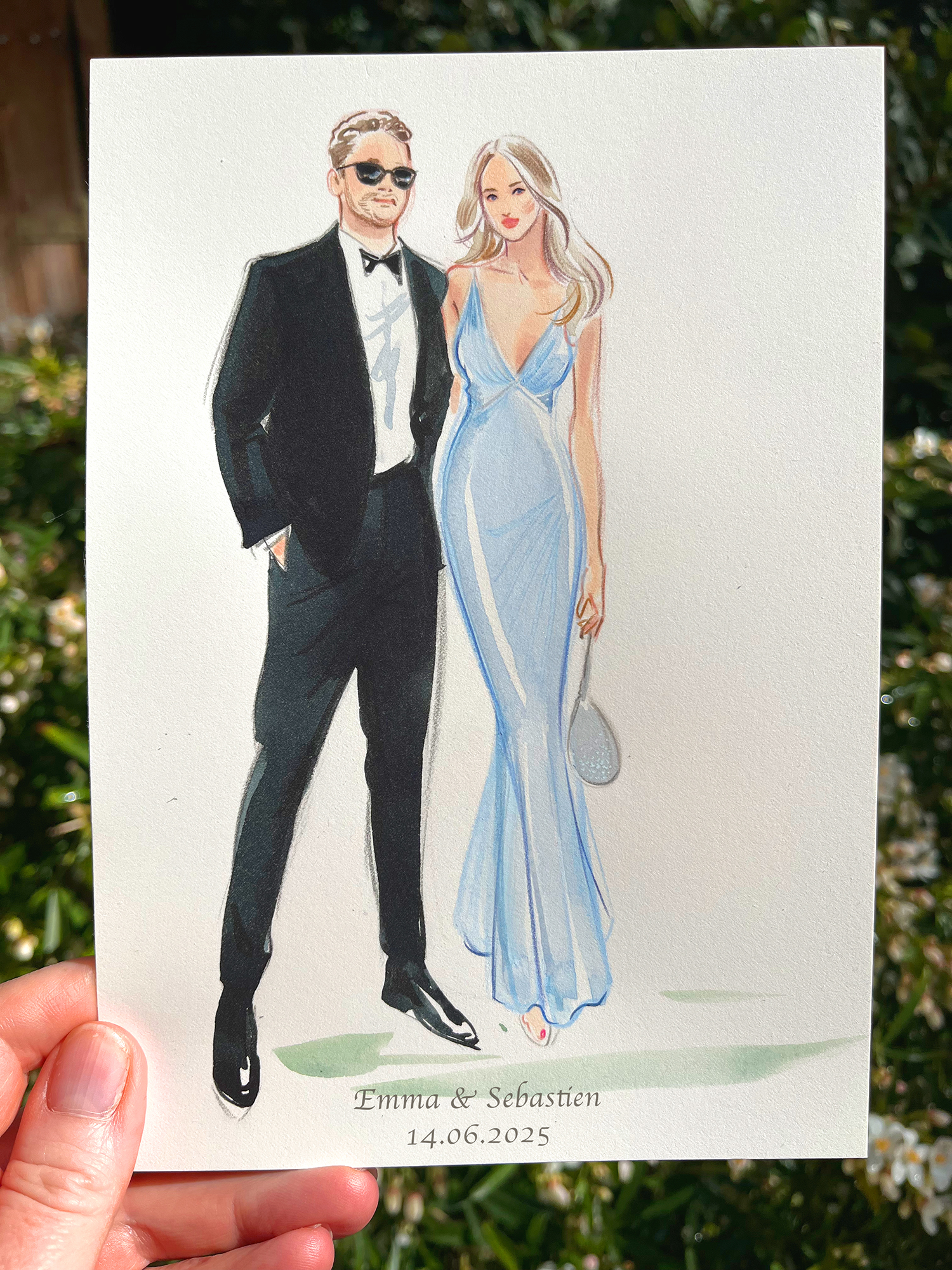 Each drawing is done on the spot and then given to the guests, who leave with a personalised memento of the event. They can choose to pose while the drawing is being created, or just long enough for a photo, which I then use as a model for the drawing.